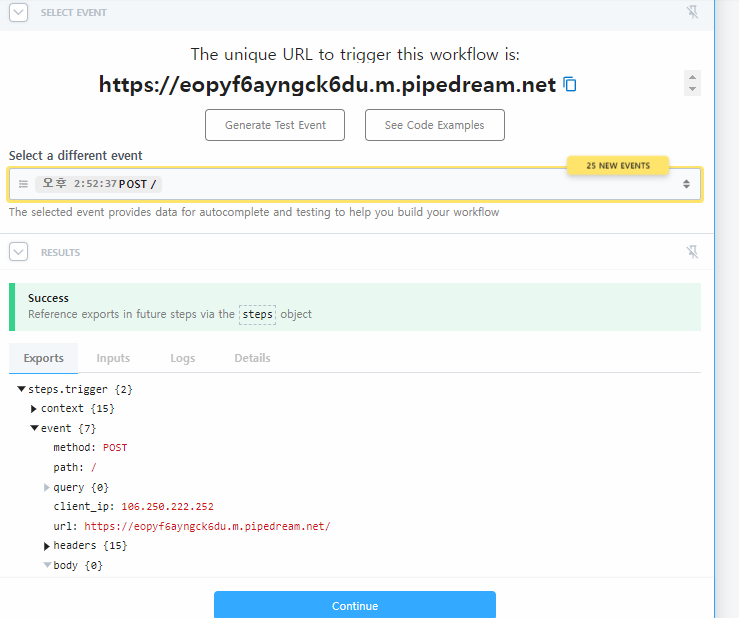 결과는 서비스에서 설정한 이벤트가 발생할때마다 웹훅호출이된다. 이벤트가 발생하면 requestbin에서는 new event 라고 띄워주는데 원하는 이벤트를 클릭하면 어떤 결과가 발생했는지 친절히 알려준다.