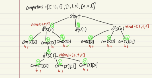 4.첫 번째 반복문은 모든 노드에 대해 순차적으로 반복합니다. 만약 아직 방문하지 않은 노드라면, 해당 노드부터 시작하여 DFS를 수행하고 네트워크 개수를 증가시킵니다.