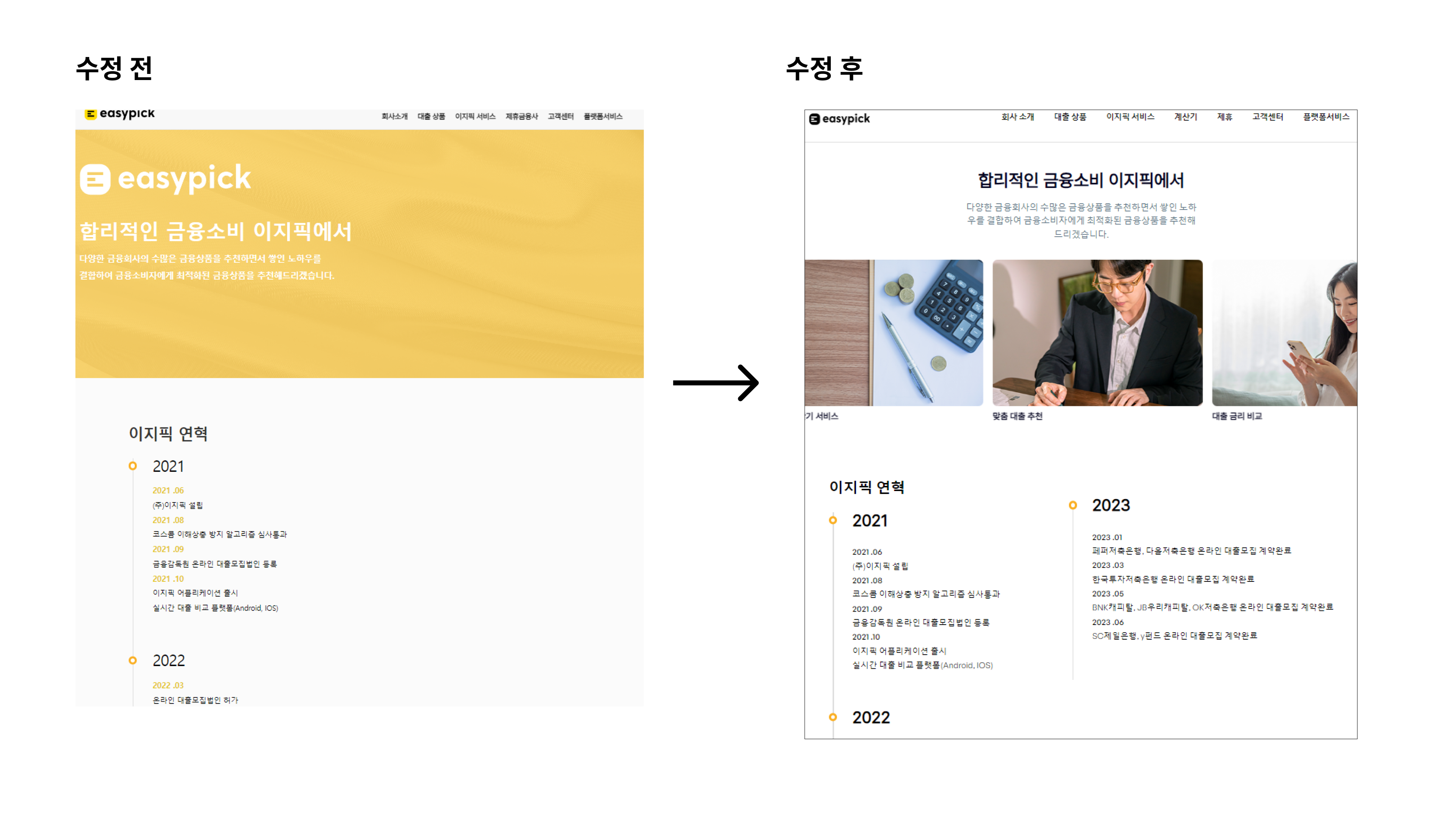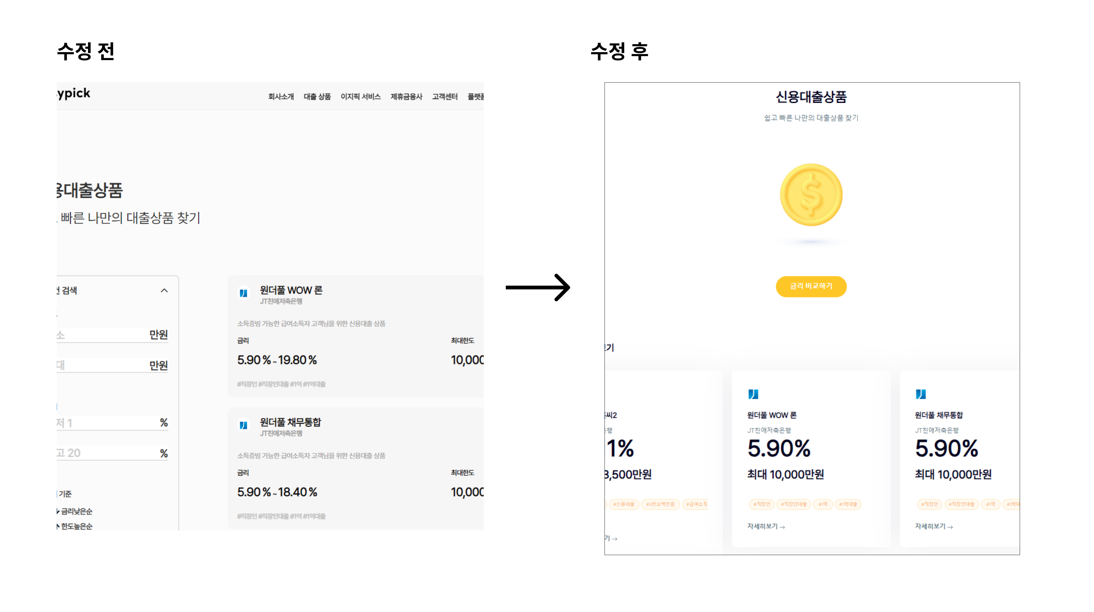 대출 상품 소개 페이지는 우리와 제휴하고 있는 금융사들에서 제공하는 대출 목록들을 설명하고 있는 페이지 이다. 이는 사용자들에게 우리가 제공하는 대출의 종류를 설명하고, 알맞은 상품을 선택하도록 도와드리는 페이지 이기 때문에 이 또한 중요한 사안 중 하나였다. 이전 버전과의 비교를 통해 주요 개선 사항을 자세히 살펴보자.