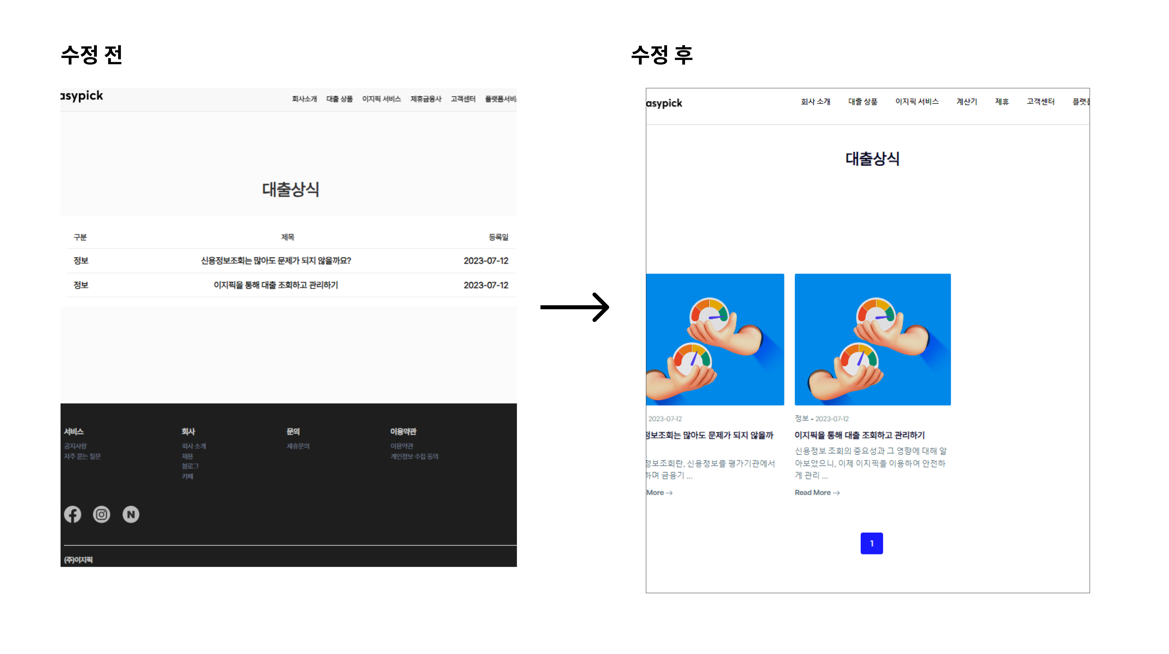 회사 소개 페이지는 단순한 텍스트 나열에서 벗어나, 주요 서비스들을 슬라이드 형식으로 시각적으로 표현했다. 대출 상식 페이지는 썸네일과 글 요약을 추가하여 사용자들이 빠르게 내용을 파악할 수 있도록 개선했다.