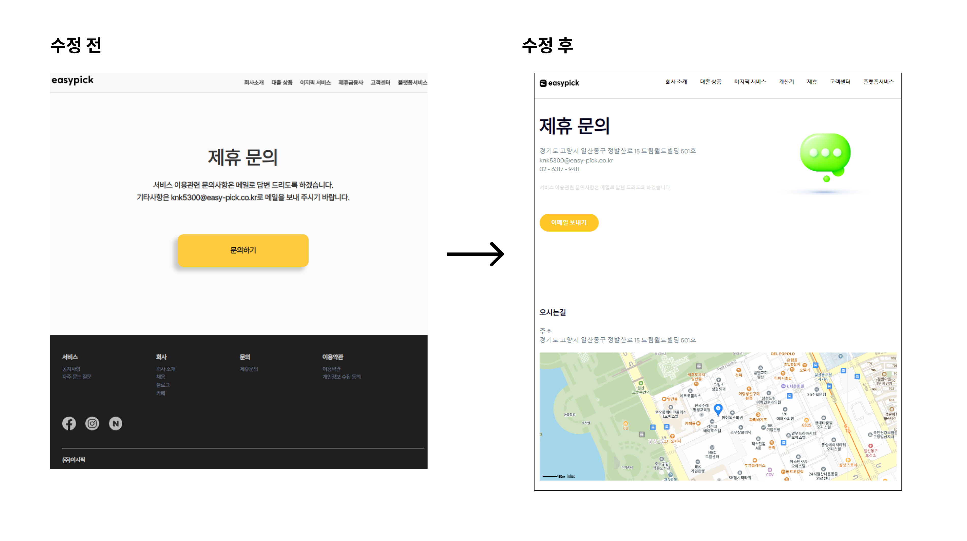 제휴 문의 페이지는 중요한 페이지로, 이전에는 문의하기버튼 클릭 →모달창 열림 → 이메일을 복사 버튼 클릭 → 이메일 보낼 사이트로 이동 → 이메일을 붙여넣기 → 문의 등의 사용자가 여러 단계를 거쳐야 하는 비효율적인 UI 구조였다. 이를 개선하여 이메일 복사 기능을 이메일 보내기로 변경해 클릭 한 번으로 이메일을 보낼 수 있도록 했고, 회사의 위치 정보도 직관적으로 제공하여 사용자 편의를 높였다.