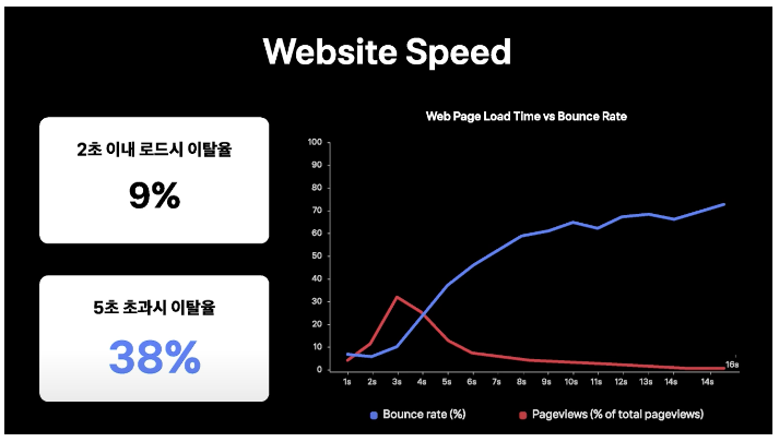페이지가 2초 이내에 로딩되는 페이지의 평균 이탈률이 9 %를 보이지만, 페이지 로딩 시간이 3초를 넘기자마자 이탈률이 치 솟아 5초가 되면 38% 에 달한다. 이처럼 웹사이트의 로딩 속도는 고객획득에 영향을 크게 주게 된다.