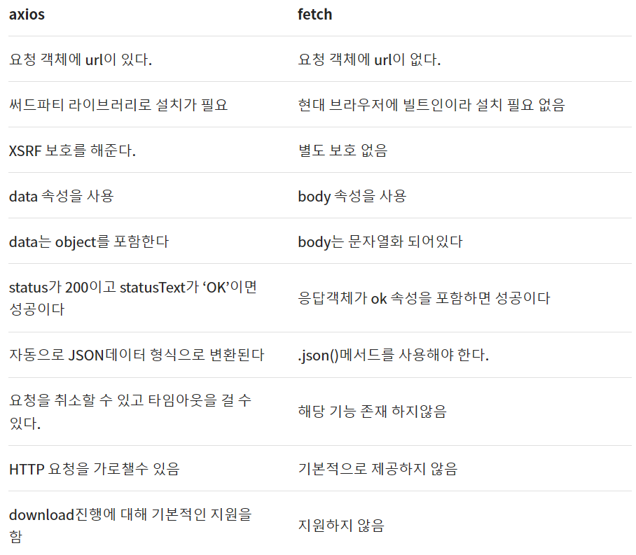 일종의 자바스크립트에 내장되어 있는 fetch api와 유사한 기능을 하지만 차이점이 몇가지 있다. 그렇다면 axios의 장단점을 알아보기 위해 그 차이를 비교해보도록 하자 .