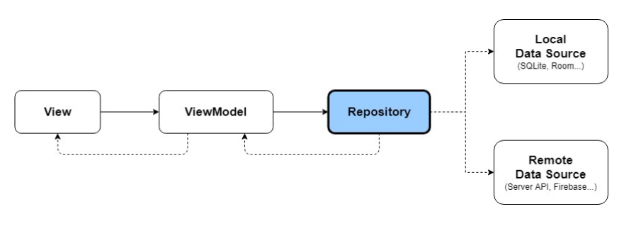 ViewModel은 필요한 데이터를 Repository에 요청하고 Repository는 적절한 저장소에서 요청받은 데이터를 가져온다.