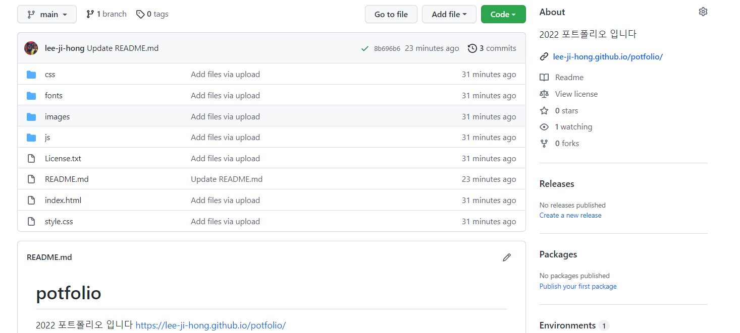 1. 우선 깃허브에 포트폴리오 레포지토리를 올려놓아야한다. (레포지토리 생성 방법은 생략)