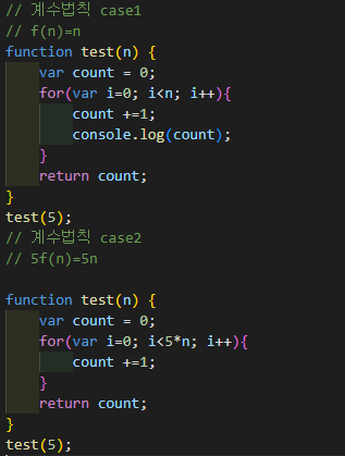 위의 예시에서 case1의 시간복잡도는 f(n)=n, case2에서의 시간복잡도는 5f(n)이다.
