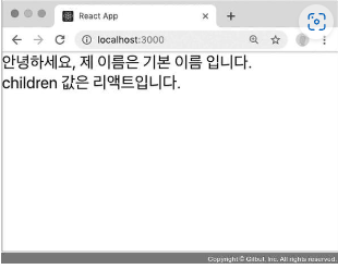 위 코드에서 MyComponent 태그 사이에 작성한 리액트라는 문자열을 MyComponent 내부에서 보여 주fu면 props.children 값을 보여 주어야 합니다.
