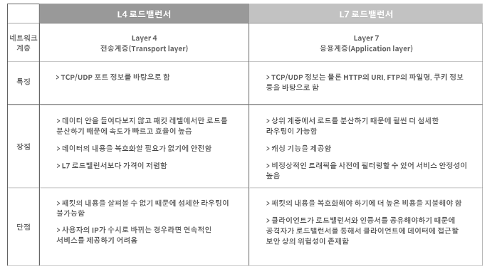 L4, L7은 각각 Layer 4(전송 계층) 프로토콜과 Layer 7(응용 계층) 프로토콜의 헤더를 부하 분산에 이용하기 때문에 붙은 접두사이다.
