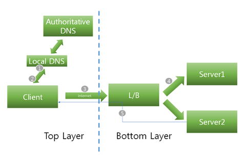 - 클라이언트가 브라우저에서 'www.google.com'이라고 입력하면 PC에 설정된 DNS 서버로 DNS 쿼리를 보내고, 로컬 DNS 서버는 'www.google.com'을 관리하는 DNS 서버로부터 L4의 VIP 주소를 획득한다.