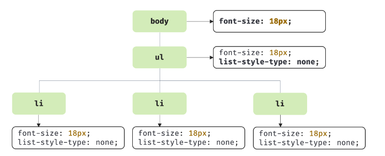 CSSOM은 CSS의 상속을 반영하여 생성된다. 위 예제에서 body 요소에 적용한 font-size 프로퍼티와 ul 요소에 적용한 list-style-type 프로퍼티는 모든 li 요소에 상속된다. 이를 통해 다음과 같은 CSSOM이 생성된다.