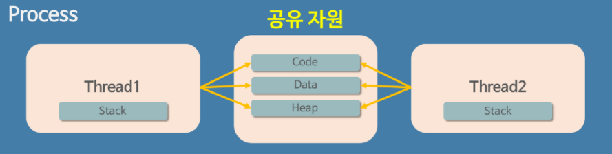 이와 다르게 스레드는 메모리를 서로 공유할 수 있다. 이에 대해 더 자세히 설명하자면, 프로세스가 할당받은 메모리 영역 내에서 stack 형식으로 할당된메모리 영역은 따로 할당받고, 나머지 Code/Data/Heap 형식으로 할당된 메모리 영역을 공유한다. 따라서 각각의 스레드는 별도의 스택을 가지고 있지만 힙, 메모리는 서로 읽고 쓸 수 있게 된다.