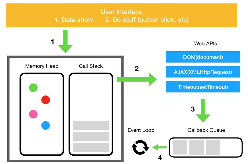 자바스크립트 엔진에서 제공해주지 않지만 자바스크립트 개발자가 사용하는 setTimeout 과 같은 API들이 있다. 이러한 API들은 브라우저에서 제공하는 Web API이다. 그리고 이런 Web API 의 호출을 제어하기 위한 콜백큐와 이벤트 루프가 있다.